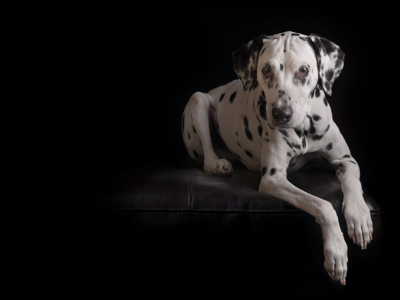 Обои Далматинец лежит на кожаном диване на черном фоне