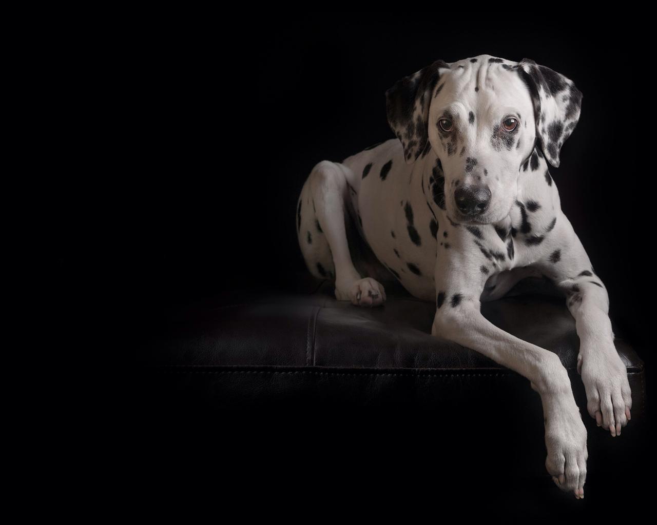Обои Далматинец лежит на кожаном диване на черном фоне