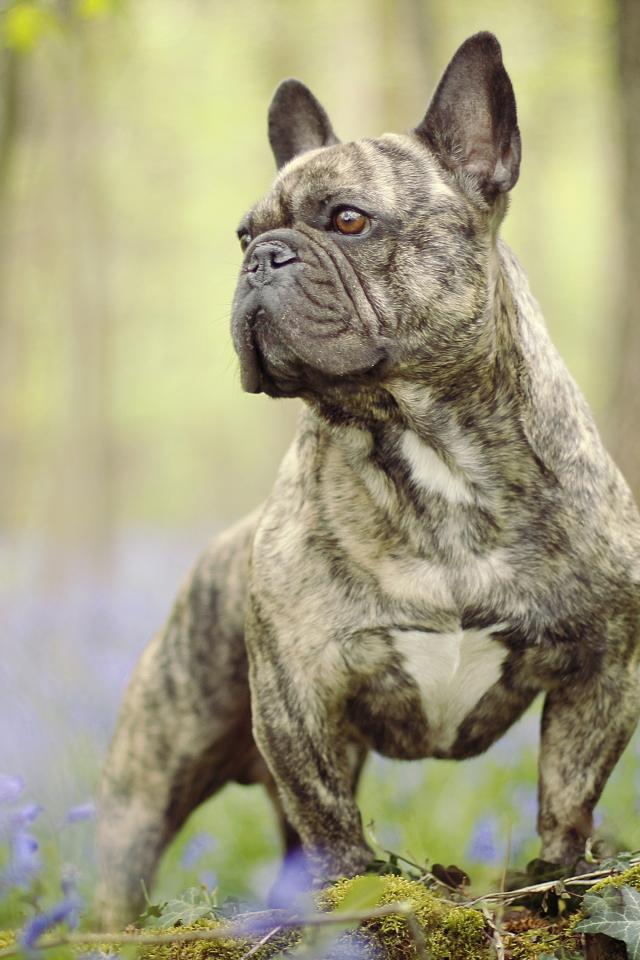 Обои Французский бульдог гуляет по лесу