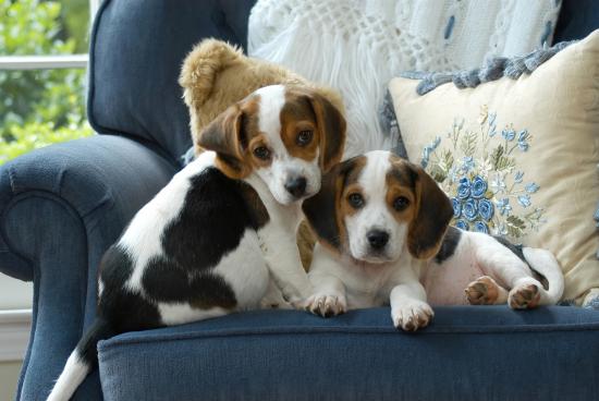 Обои Два маленьких щенка бигля сидят на диване