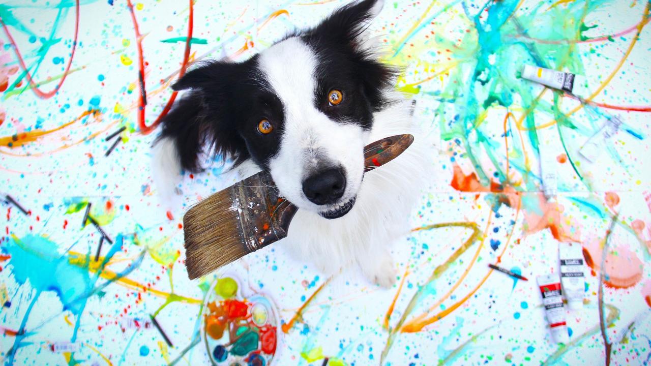 Обои Собака породы бордер колли с кисточкой в пасти