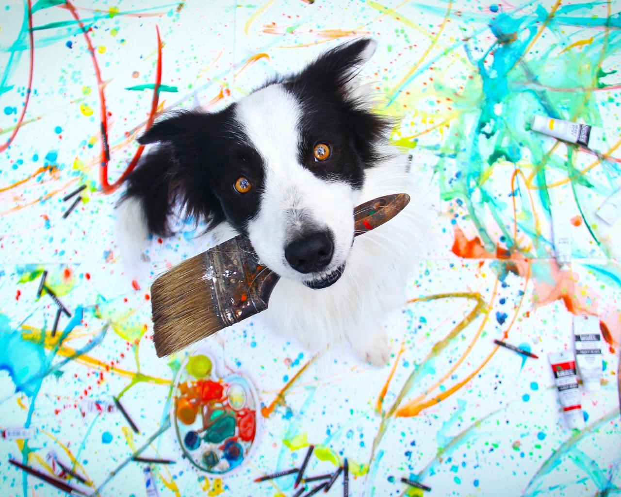 Обои Собака породы бордер колли с кисточкой в пасти