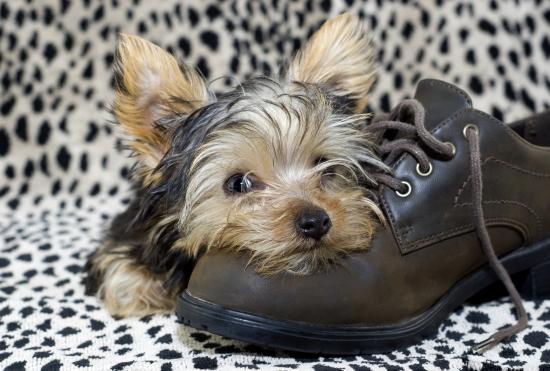 Обои Щенок йоркширского терьера спит на кожаном ботинке