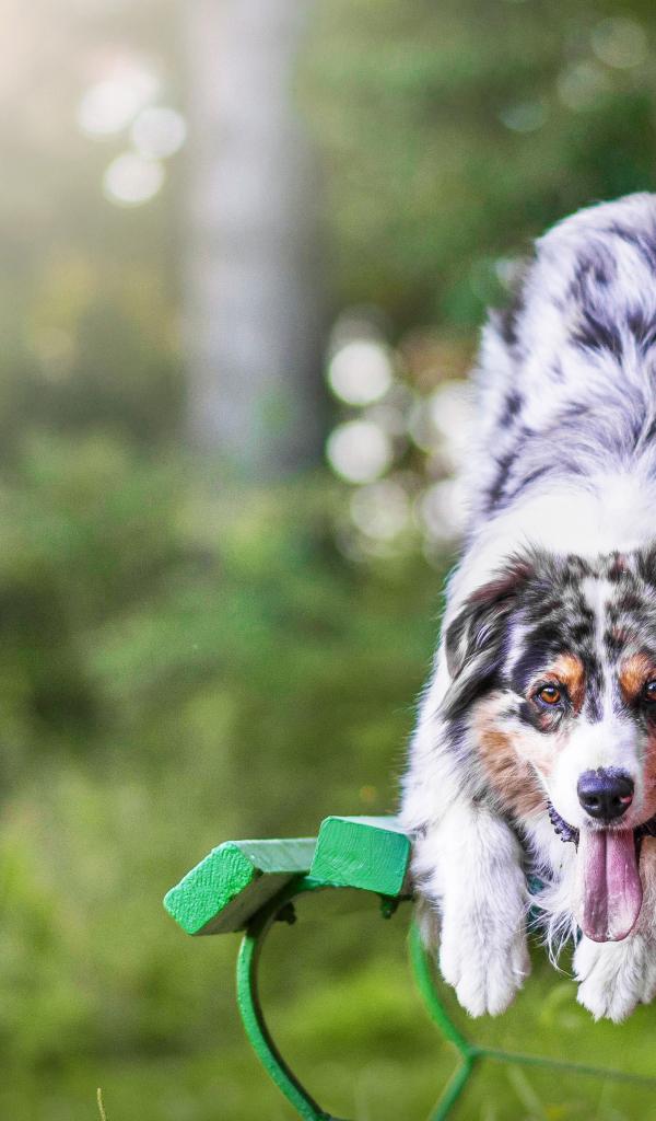 Обои Австралийская овчарка с высунутым языком на лавке