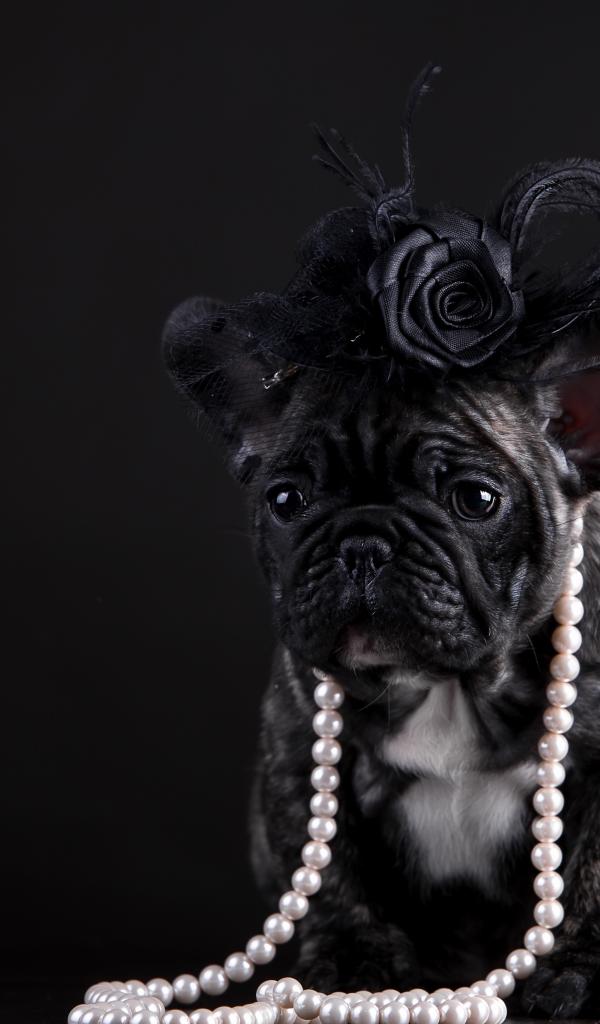 Обои Щенок французского бульдога в бусах и шляпке