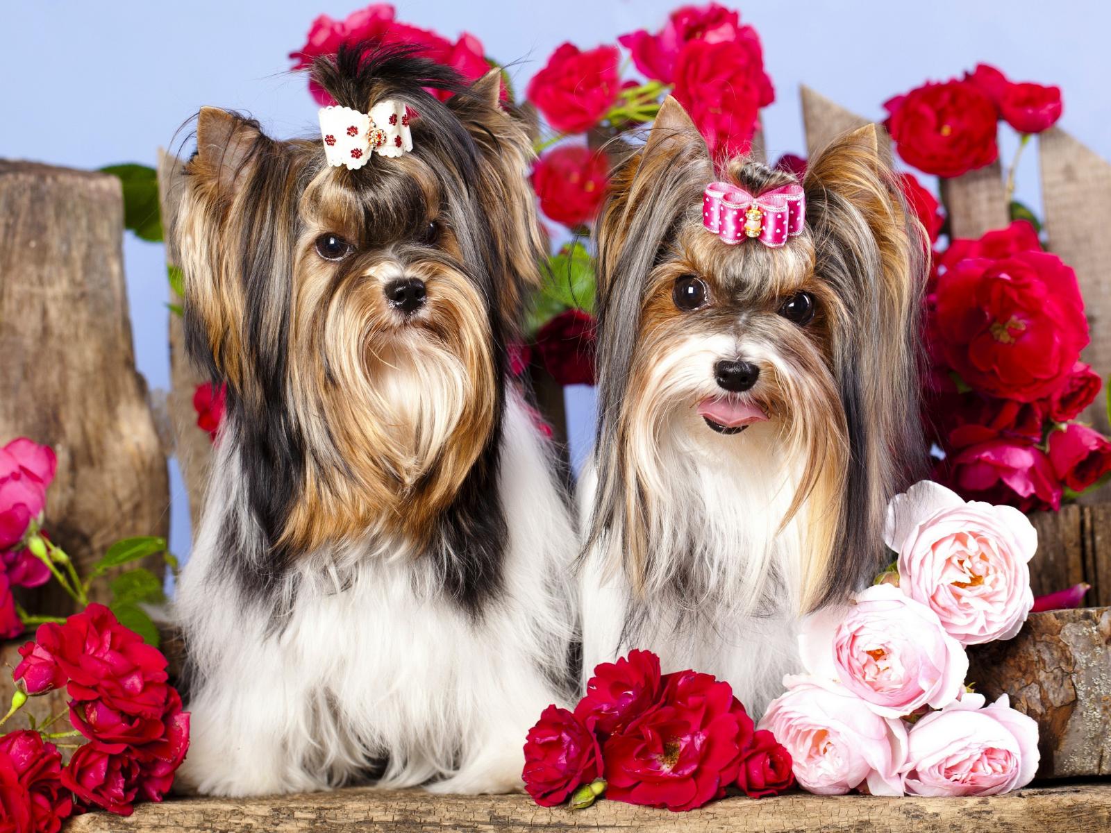 Обои Два йоркширских терьера с красными цветами розы