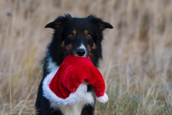 Обои Собака с шапкой Санта Клауса в зубах