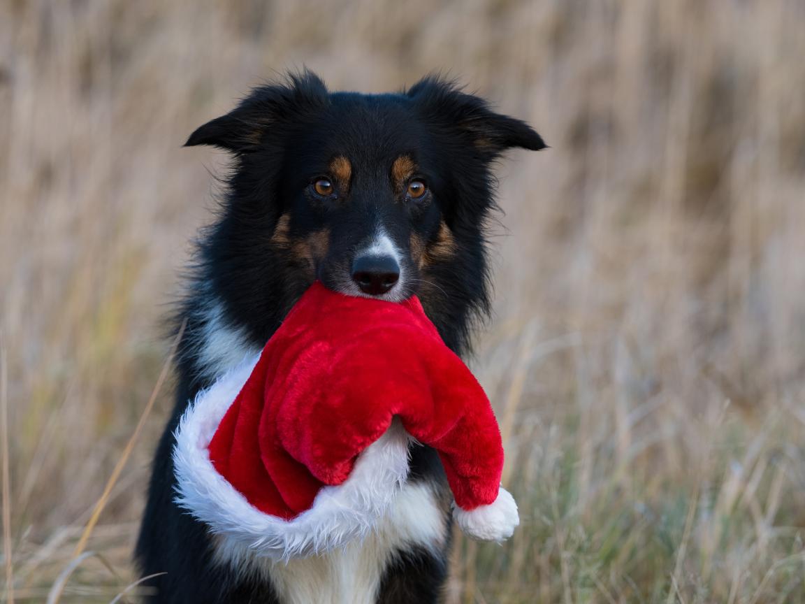 Обои Собака с шапкой Санта Клауса в зубах
