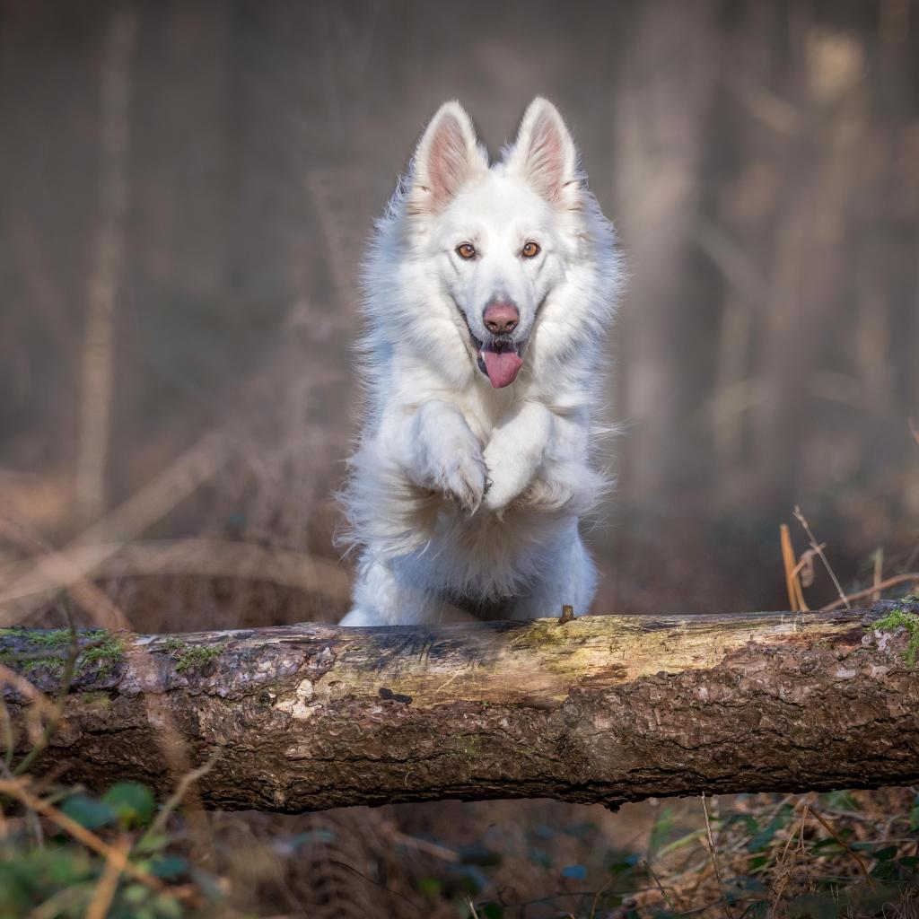 Обои Белая овчарка перепрыгивает через упавшее дерево