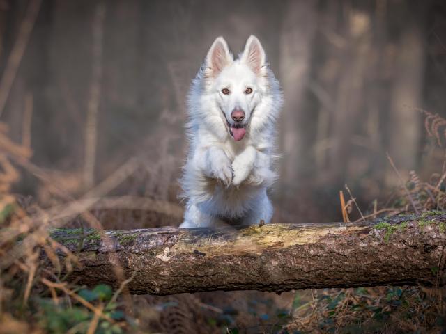 Обои Белая овчарка перепрыгивает через упавшее дерево