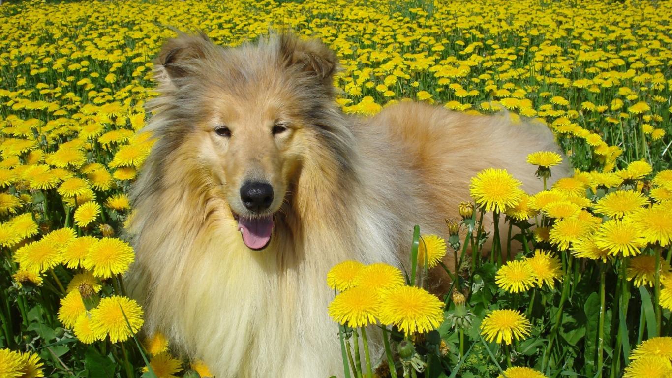 Обои Длинношёрстный колли лежит в желтых одуванчиках