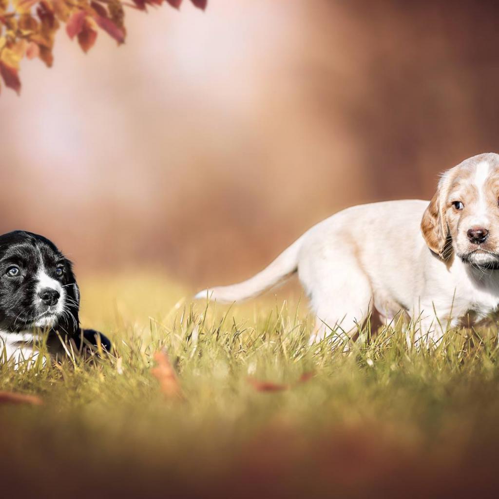 Обои Два маленьких щенка спаниеля в зеленой траве