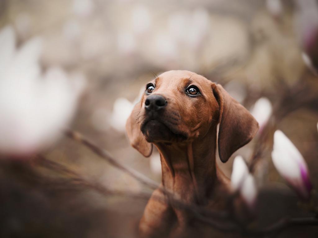 Обои Маленькая грустная такса в розовых цветах