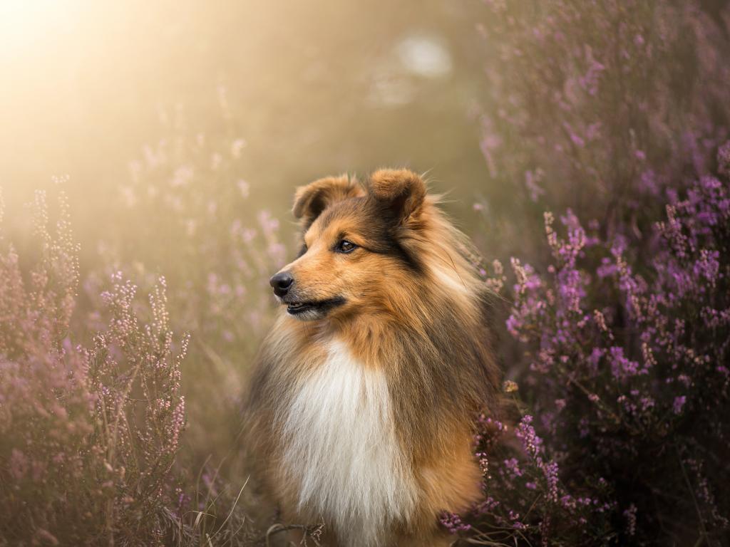 Обои Собака породы шелти в цветах