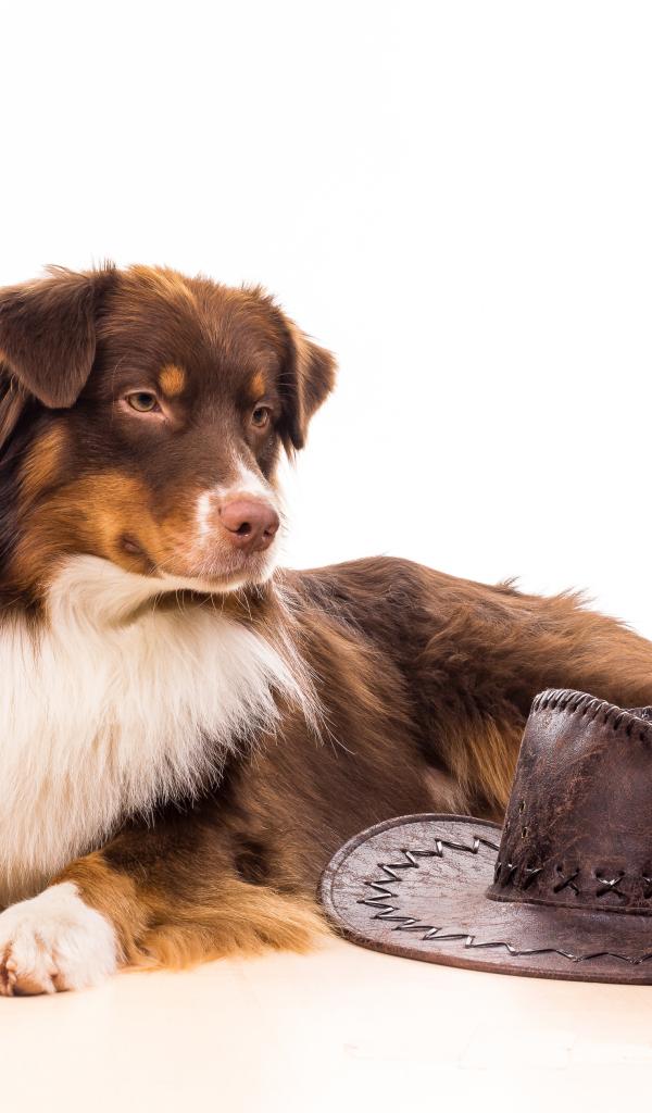Обои Австралийская Овчарка с ковбойской шляпой на белом фоне