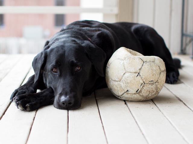 Обои Грустный черный лабрадор с футбольным мячом