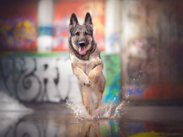 Обои Немецкая овчарка с высунутым языком бежит по воде