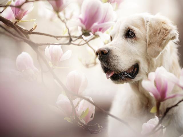 Обои Золотистый ретривер с высунутым языком в розовых цветах