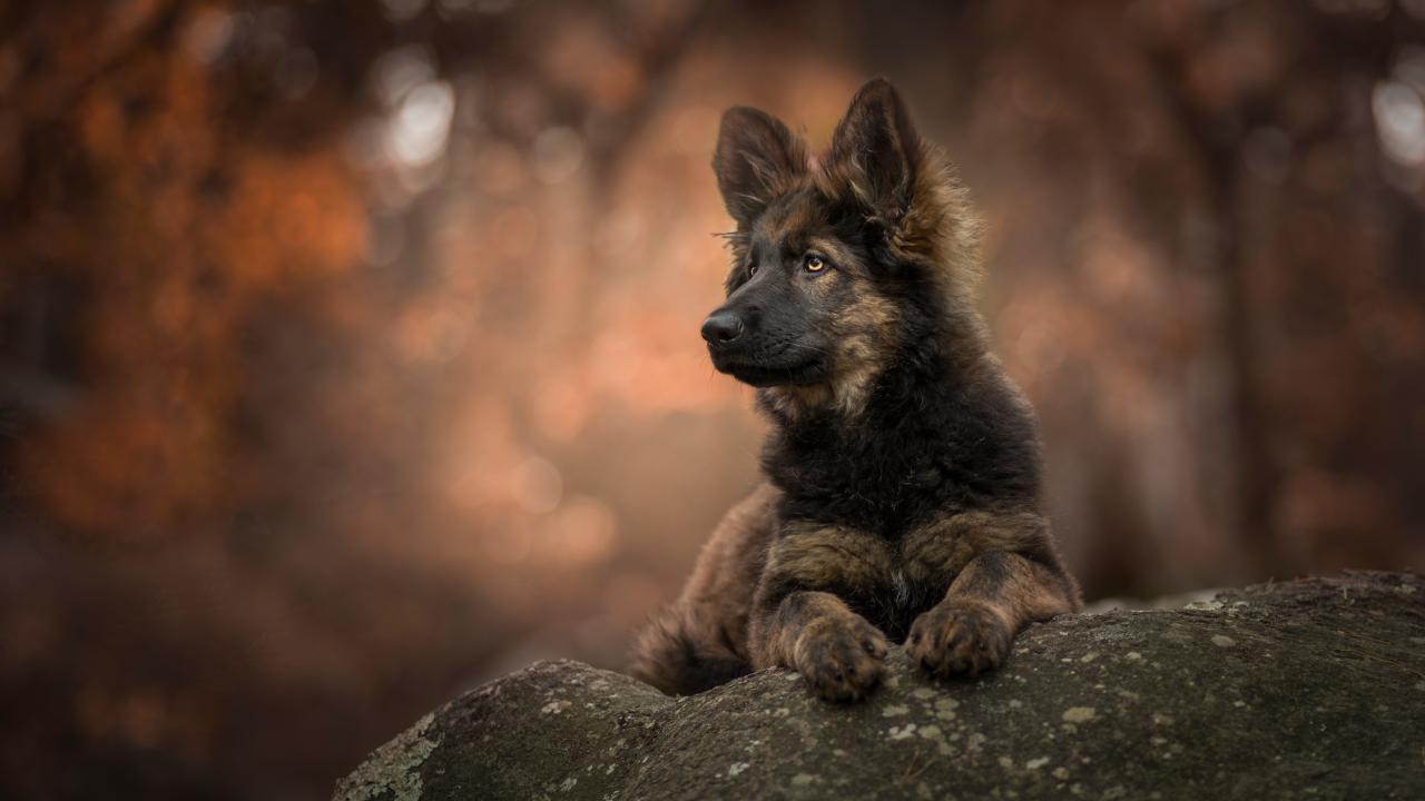 Обои Щенок немецкой овчарки лежит на камне