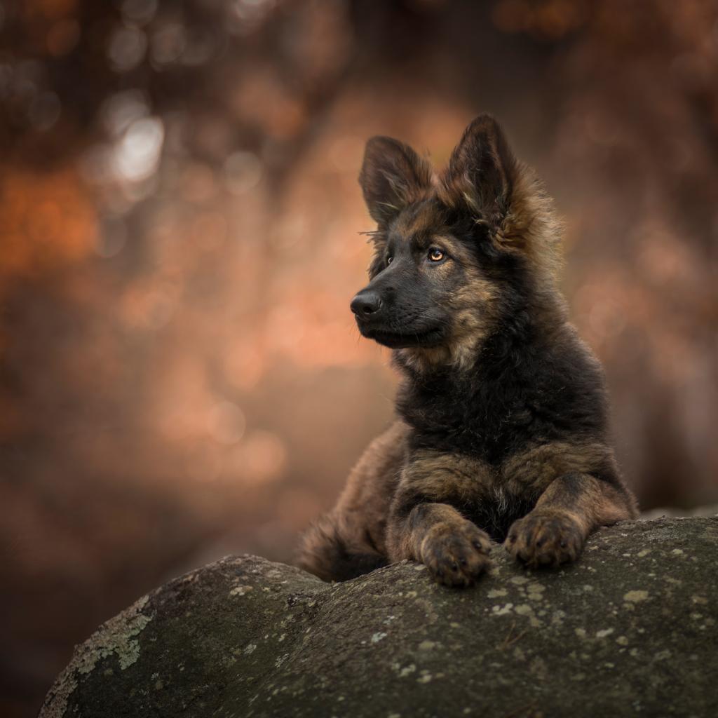 Обои Щенок немецкой овчарки лежит на камне