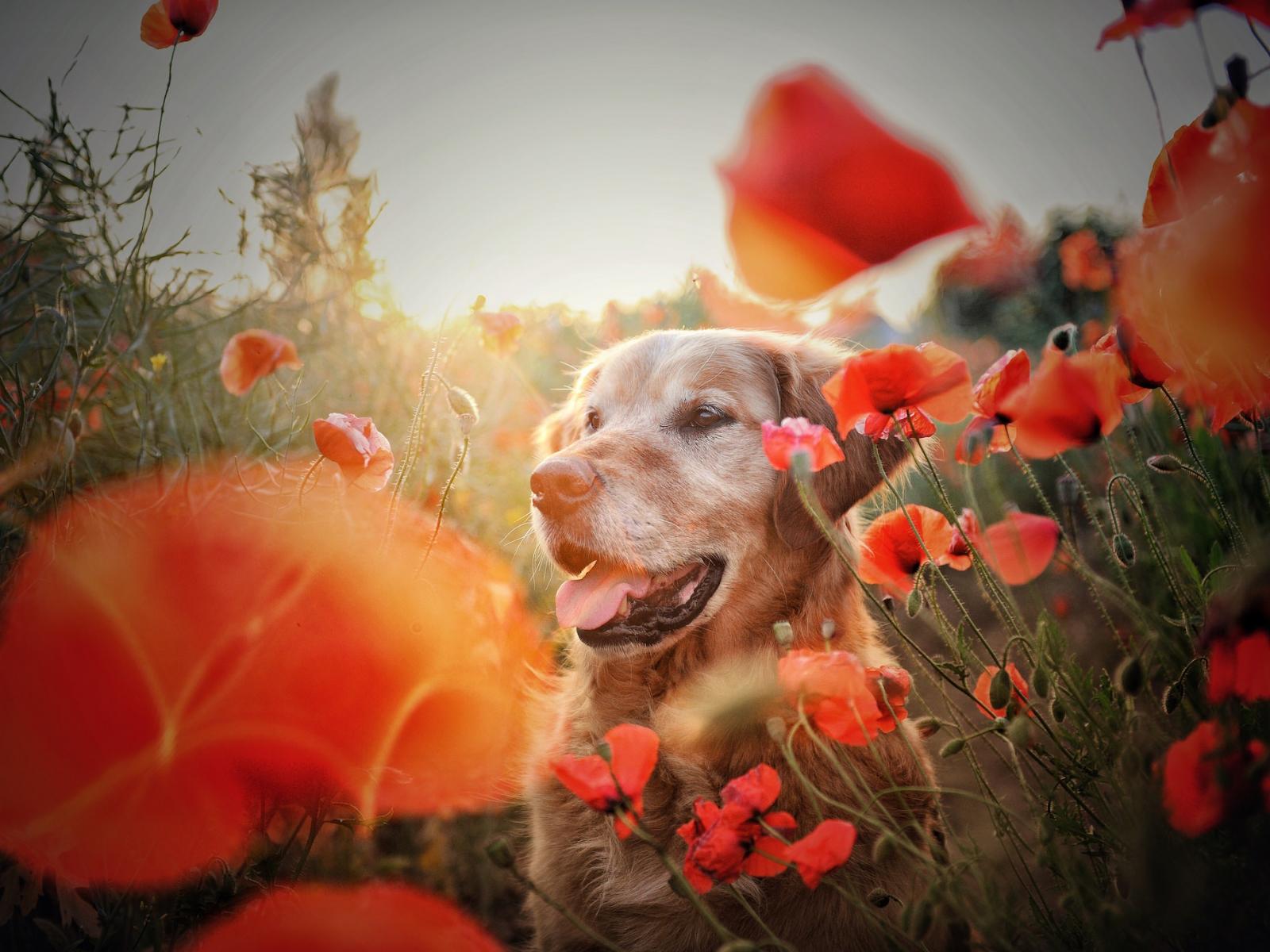 Обои Золотистый ретривер в цветах красного мака