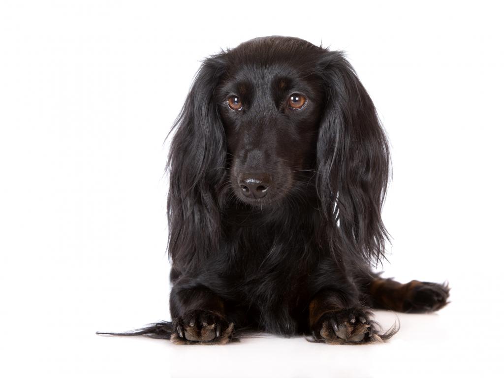 Обои Большая такса лежит с маленьким серым котенком на белом фоне