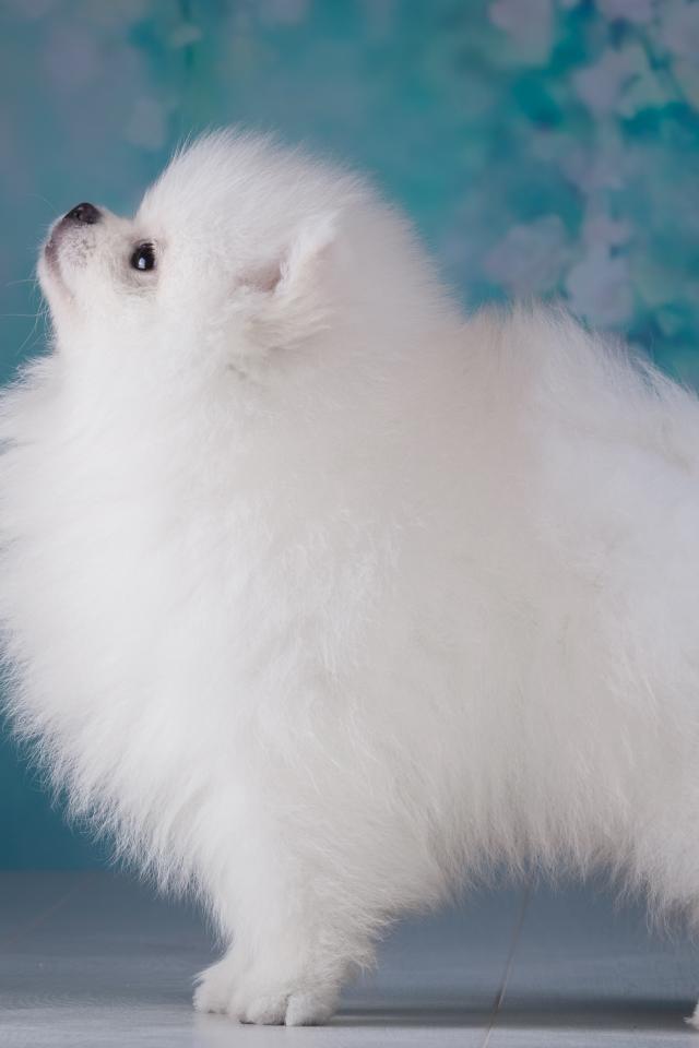 Обои Пушистый забавный белый шпиц на коричневом фоне