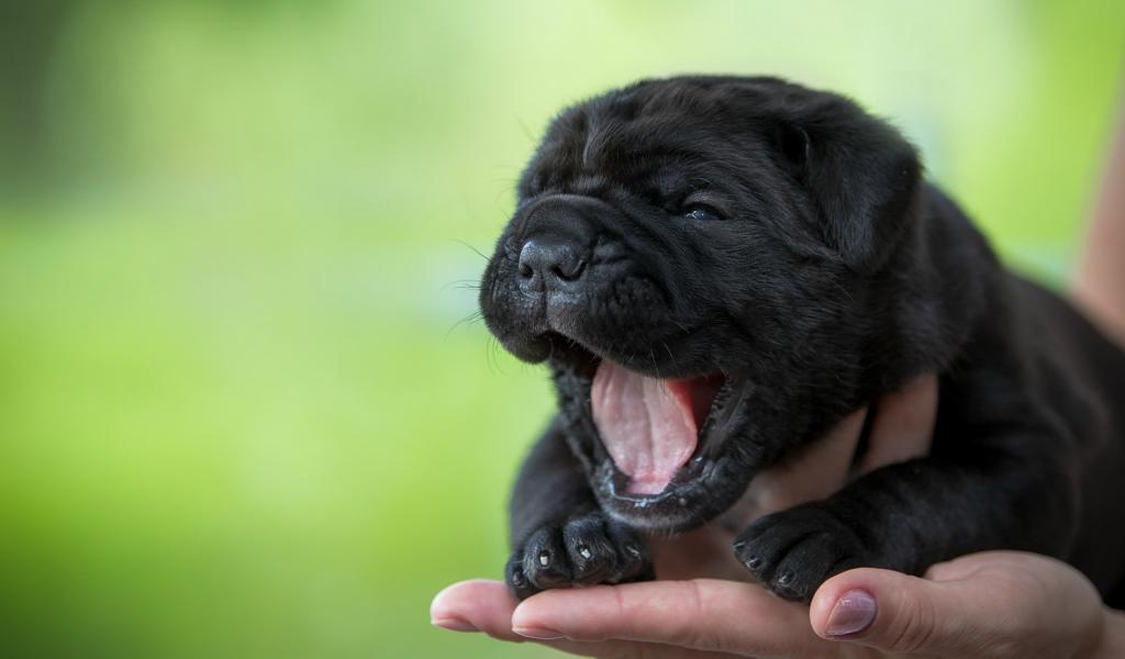 Обои Черный милый щенок Кане-корсо зевает на руке