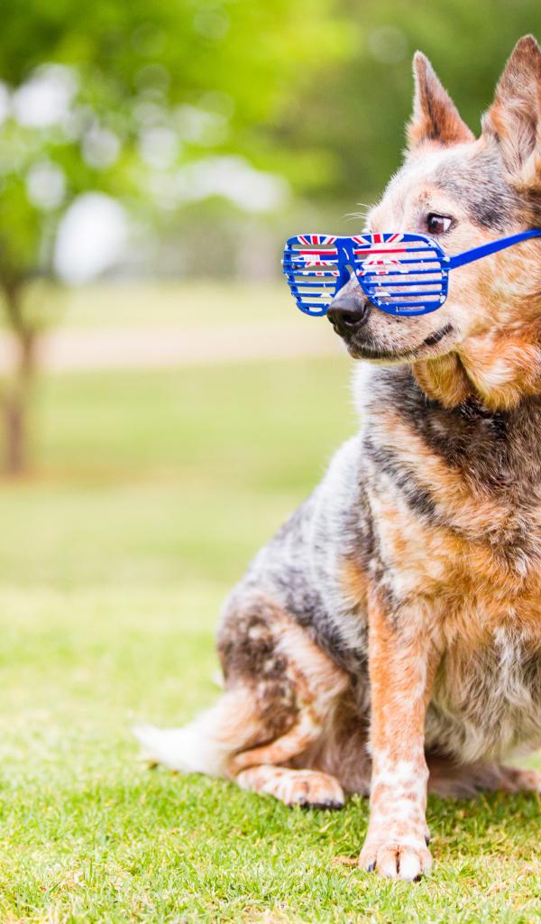Обои Австралийская пастушья собака в очках на зеленой траве