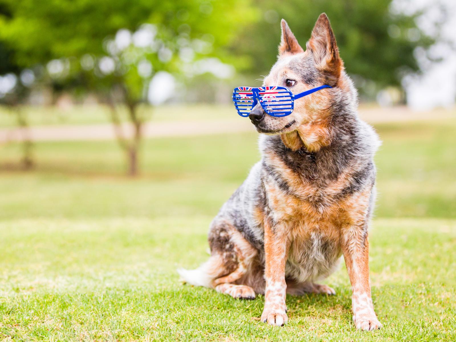 Обои Австралийская пастушья собака в очках на зеленой траве