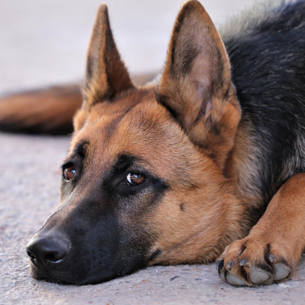 Обои Грустная немецкая овчарка лежит на асфальте