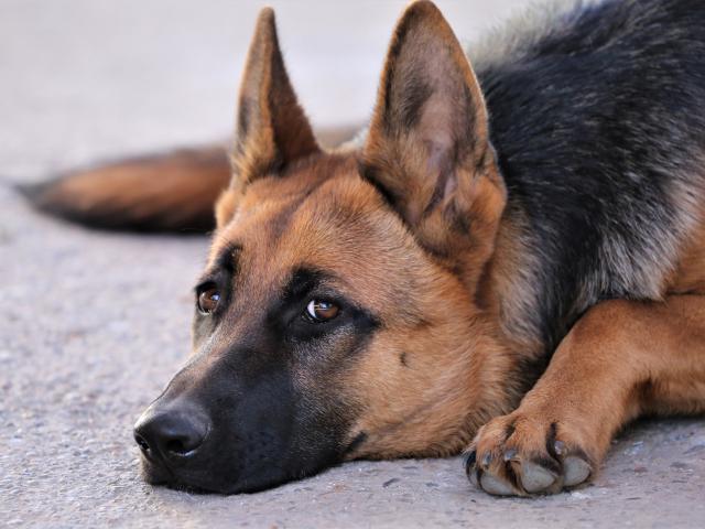 Обои Грустная немецкая овчарка лежит на асфальте