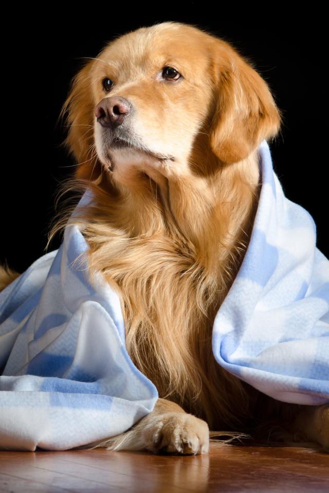 Обои Золотистый ретривер лежит под пледом на черном фоне