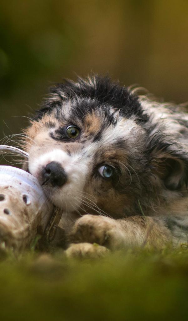 Обои Маленький щенок австралийской овчарки грызет обувь