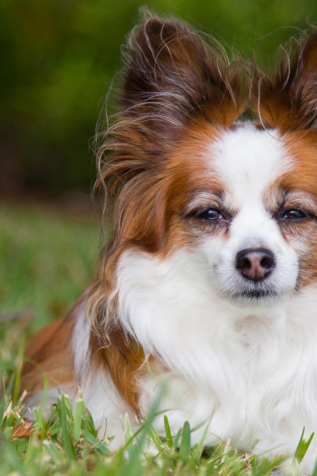 Обои Собака породы Папильон лежит на зеленой траве