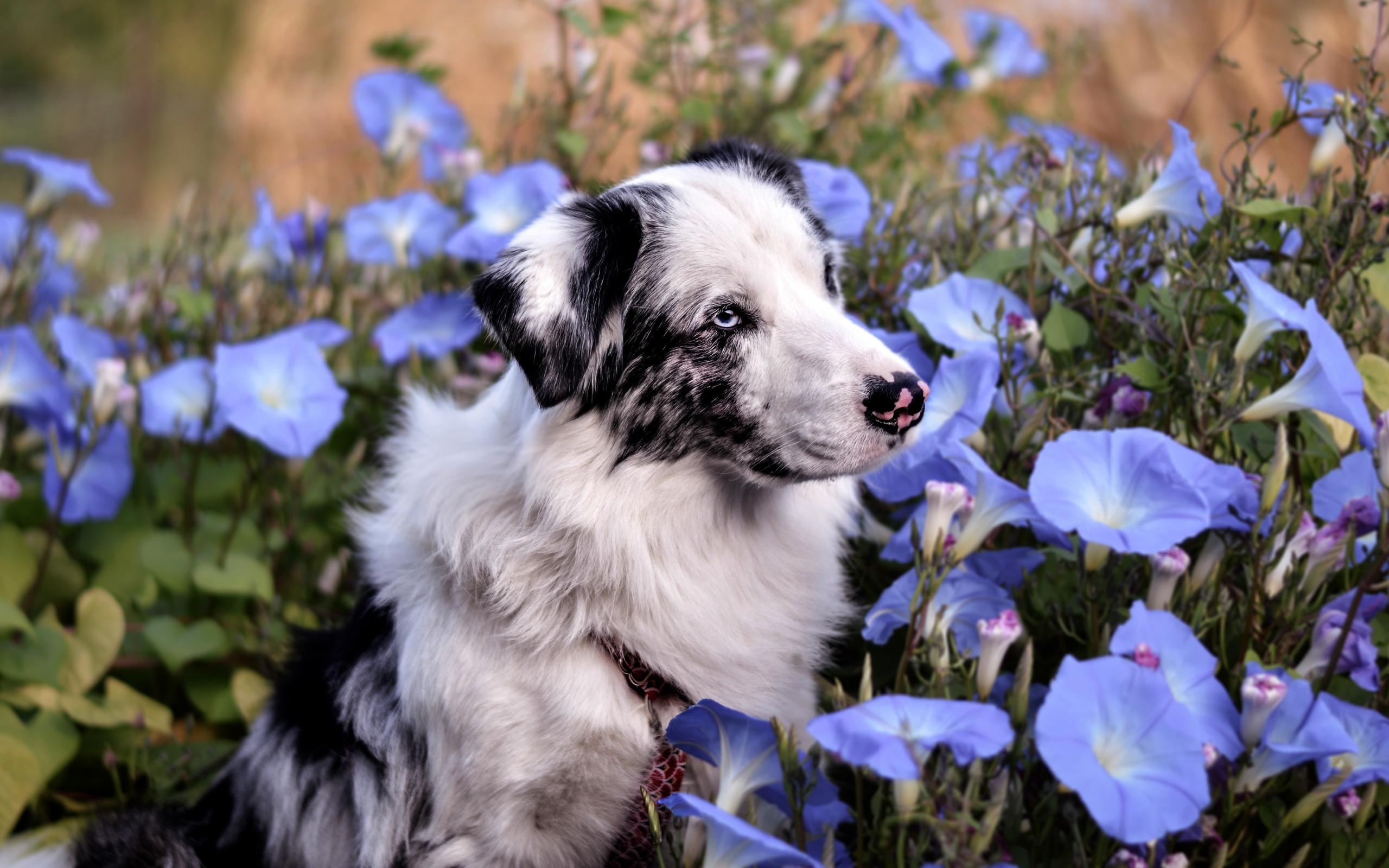 Обои Австралийская Овчарка сидит в цветах ипомеи