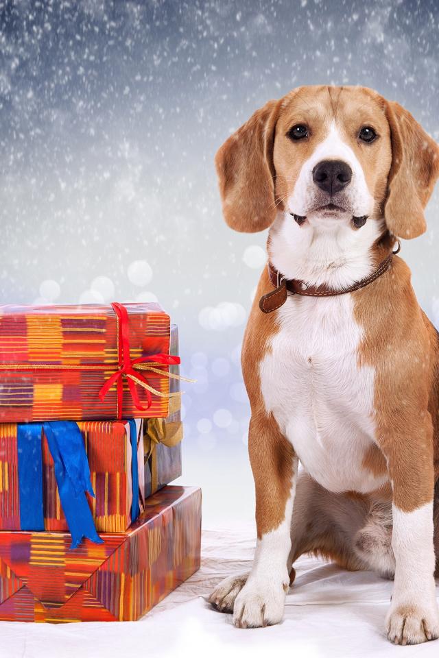 Обои Бигль с подарочными коробками на заснеженном фоне