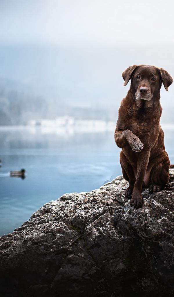 Обои Грустный коричневый пес сидит на камне у воды