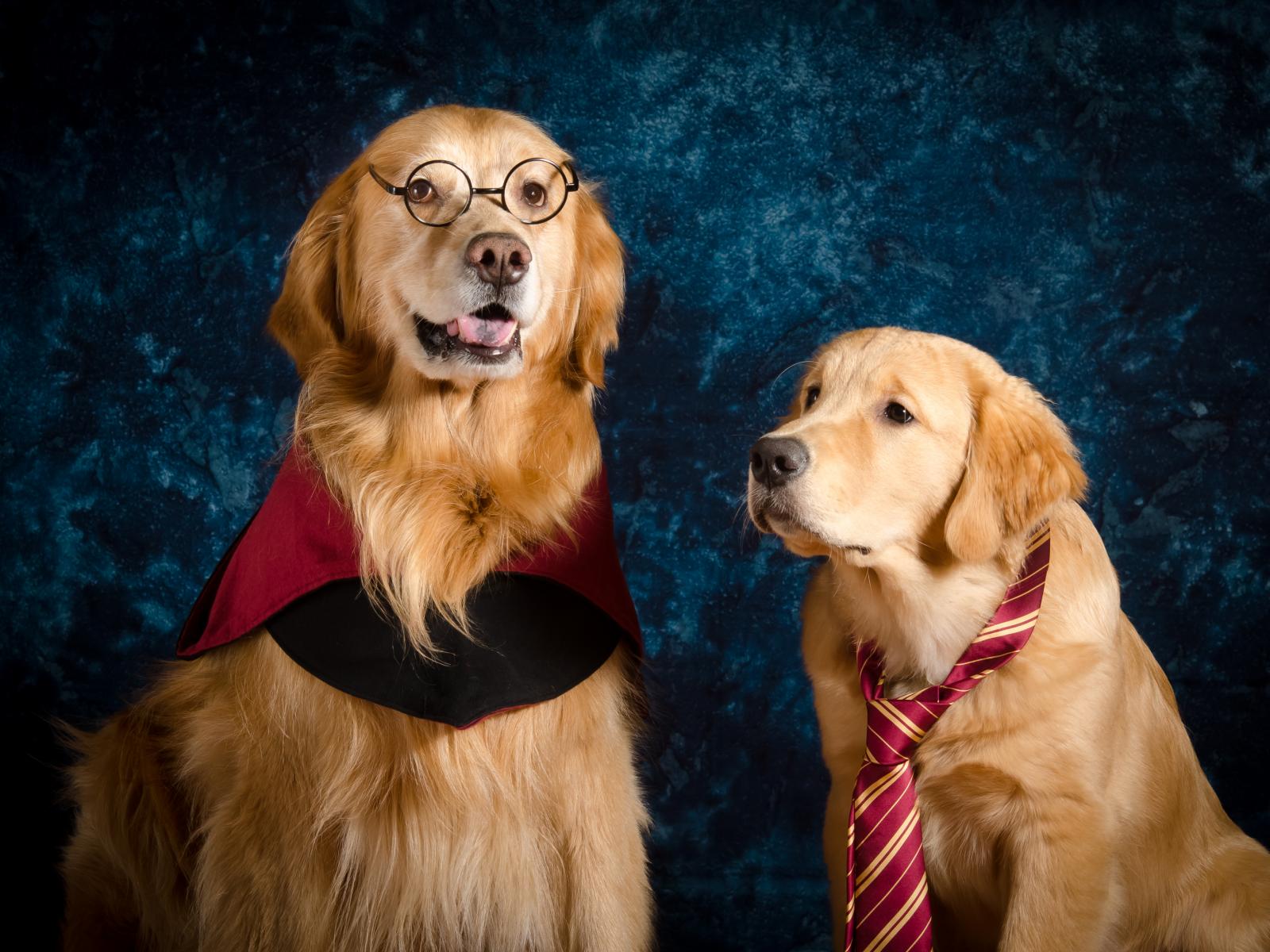 Обои Два золотистых ретривера сидят на фоне синей стены