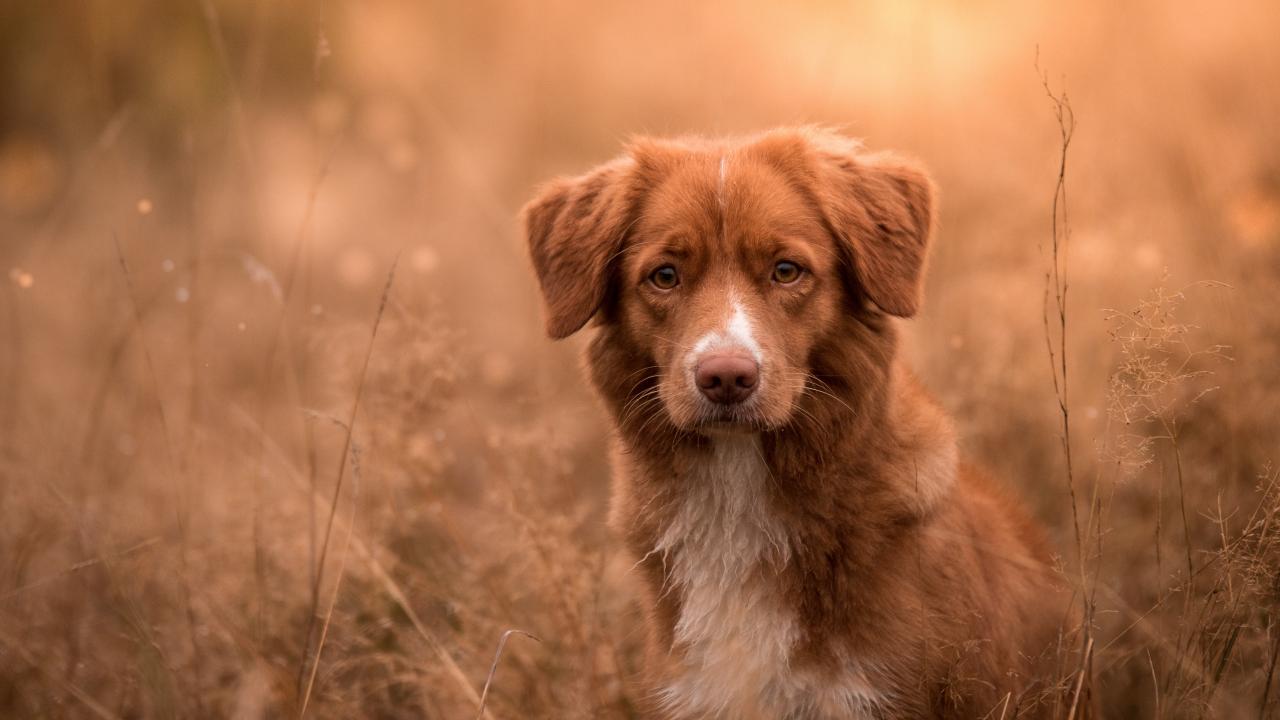 Обои Собака сидит на сухой траве осенью