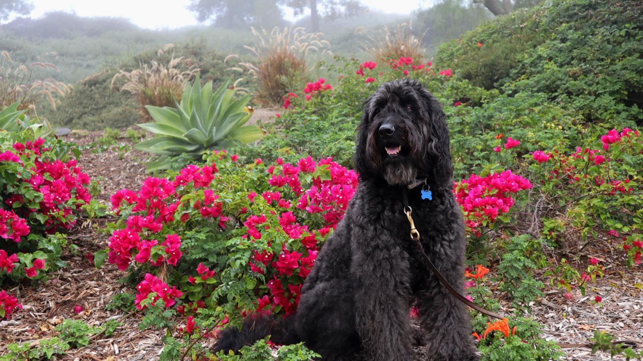 Обои Большая Испанская водяная собака сидит у красных цветов