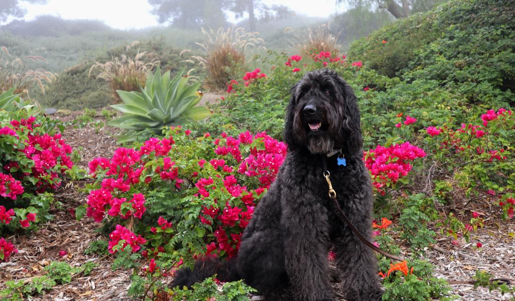 Обои Большая Испанская водяная собака сидит у красных цветов