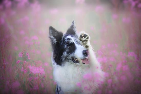 Обои Бордер-колли сидит в розовых цветах