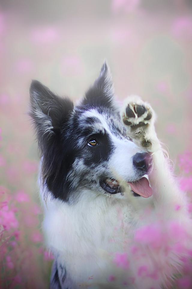 Обои Бордер-колли сидит в розовых цветах