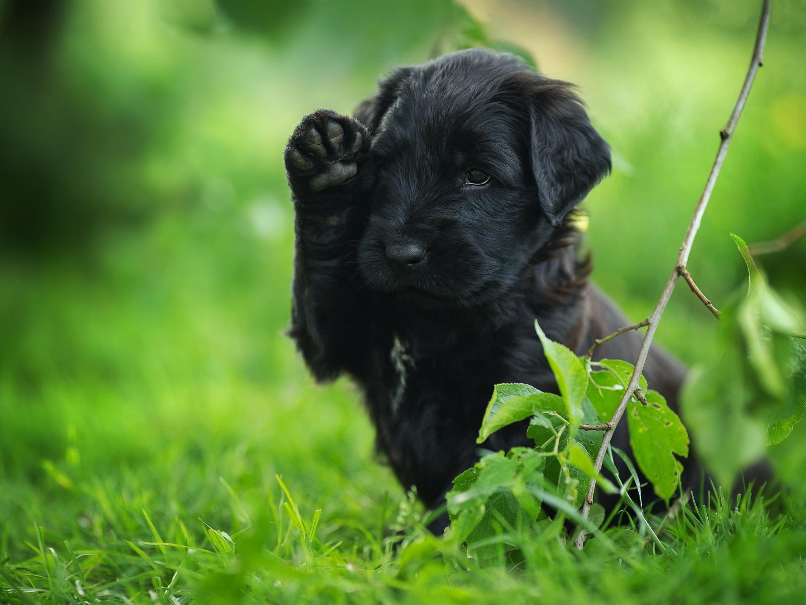 Обои Маленький черный щенок с поднятой лапой сидит в зеленой траве