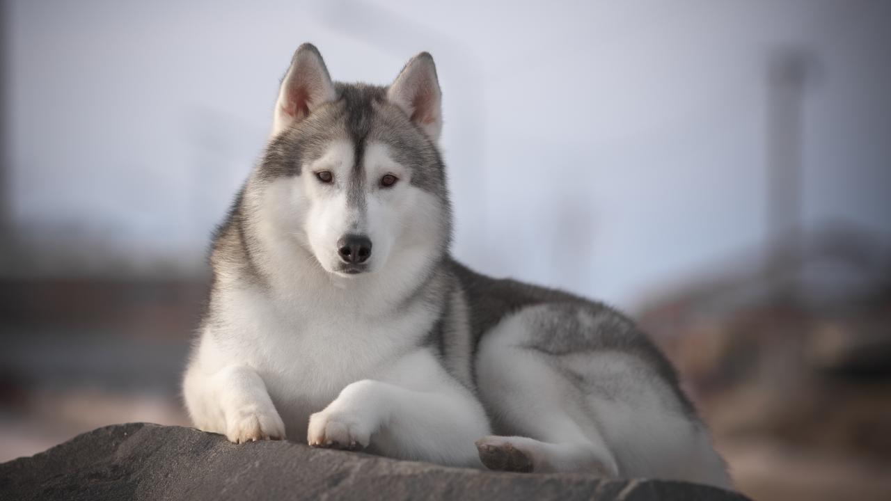 Обои Красивый пес породы хаски лежит на камне