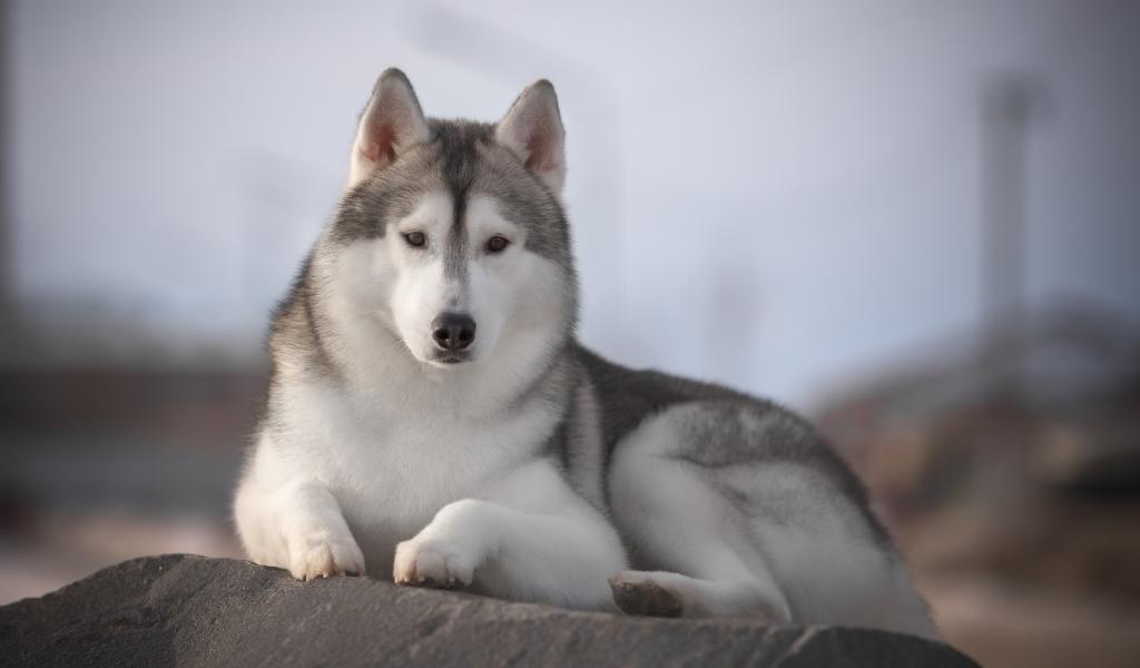 Обои Красивый пес породы хаски лежит на камне