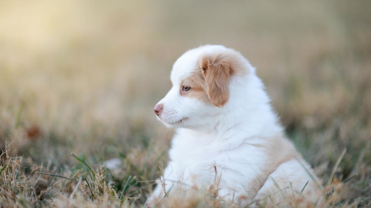 Обои Маленький щенок австралийской овчарки сидит на траве