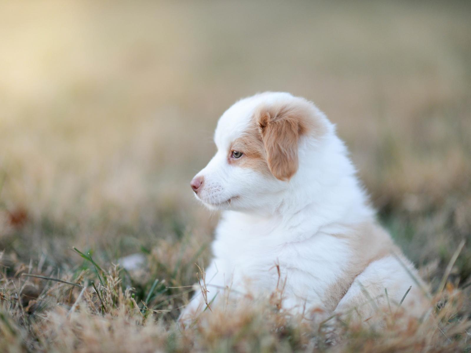 Обои Маленький щенок австралийской овчарки сидит на траве