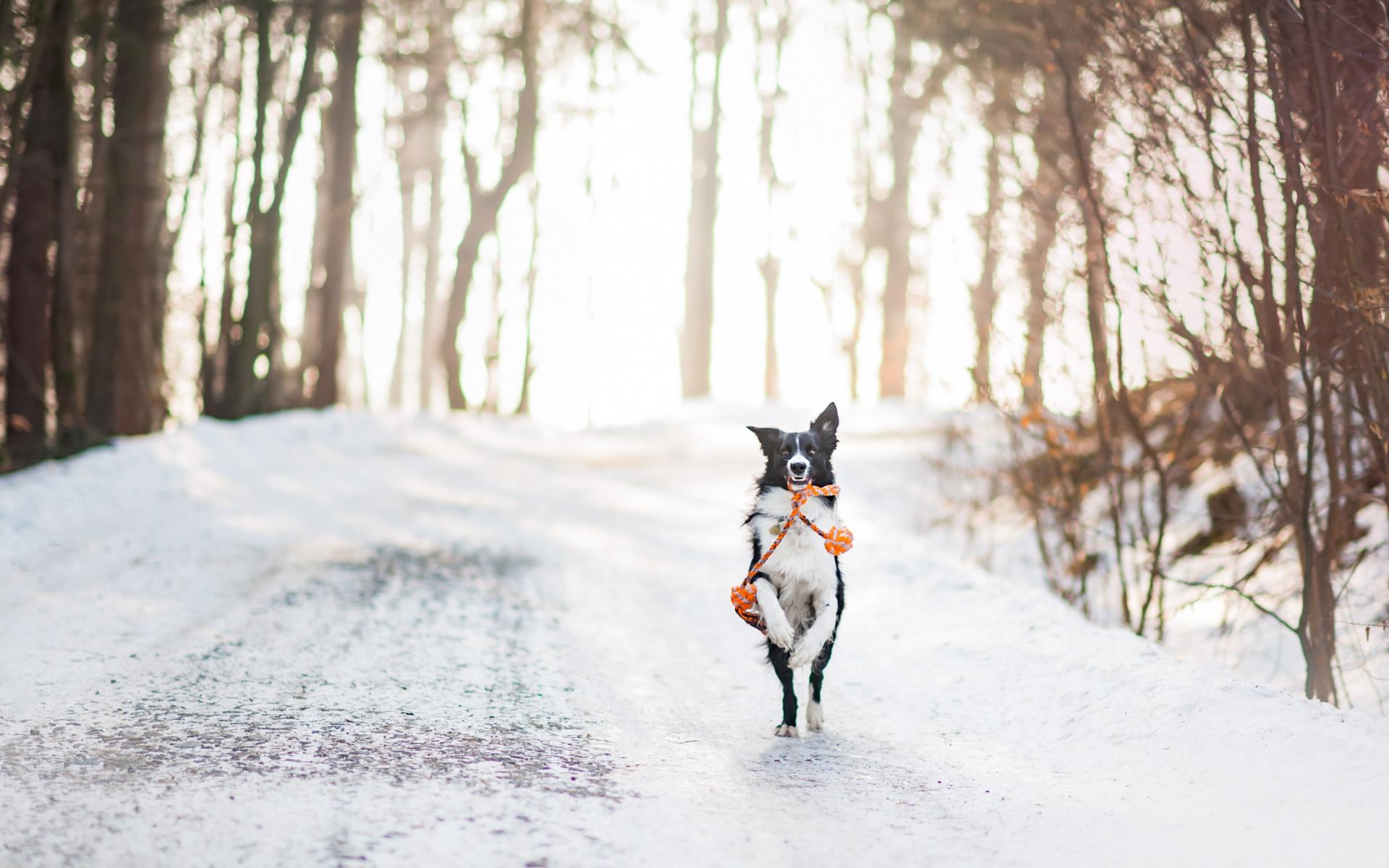 Обои Собака бордер колли бежит по заснеженной дороге